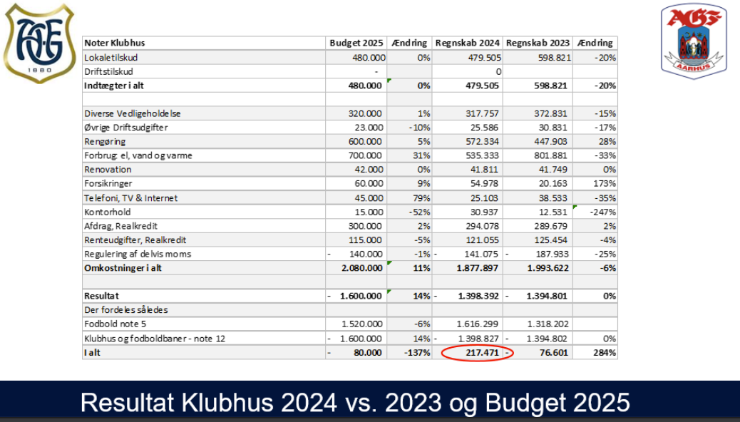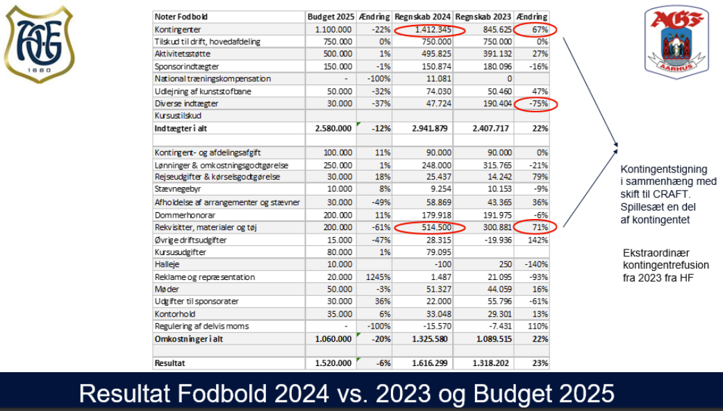 Foto: Resultat AGF 1880 Fodbold Klubhus 2024 vs. 2023 og Budget 2025.