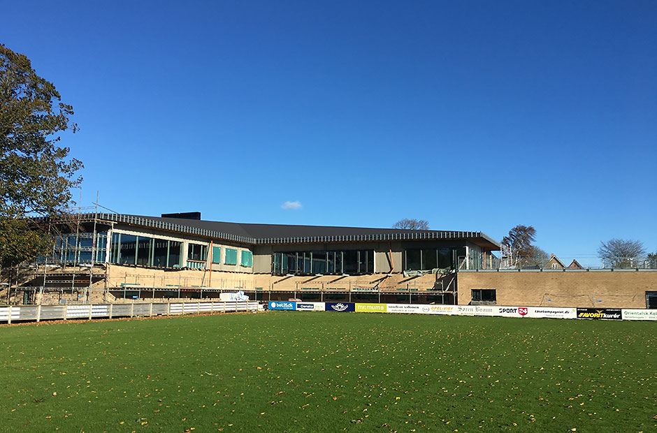 Arbejdet med det nye klubhusbyggeri på Fredensvang skrider planmæssigt fremad. Taget er lagt, vinduerne er sat i, og der mangler ikke meget, før den udvendige del er helt færdig.