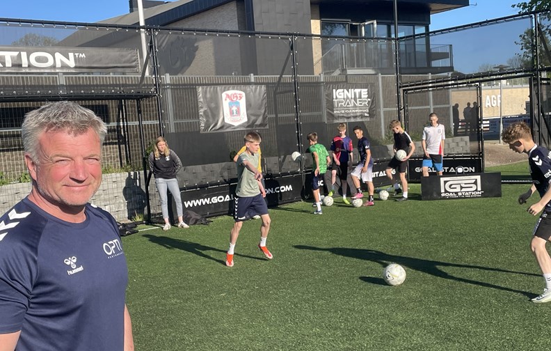 U14-spillerne i goalstation. Peter Pedersen til venstre. Privatfoto.